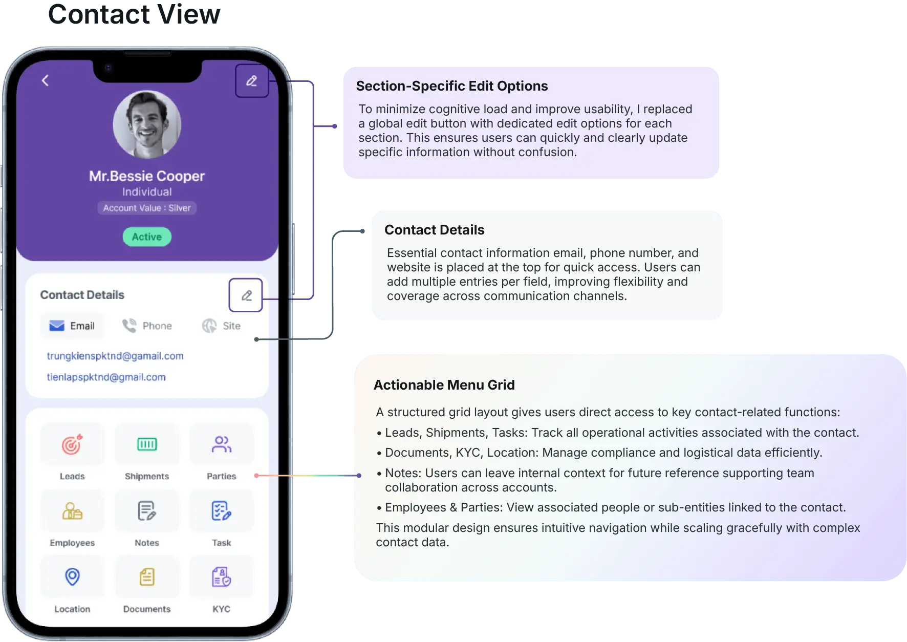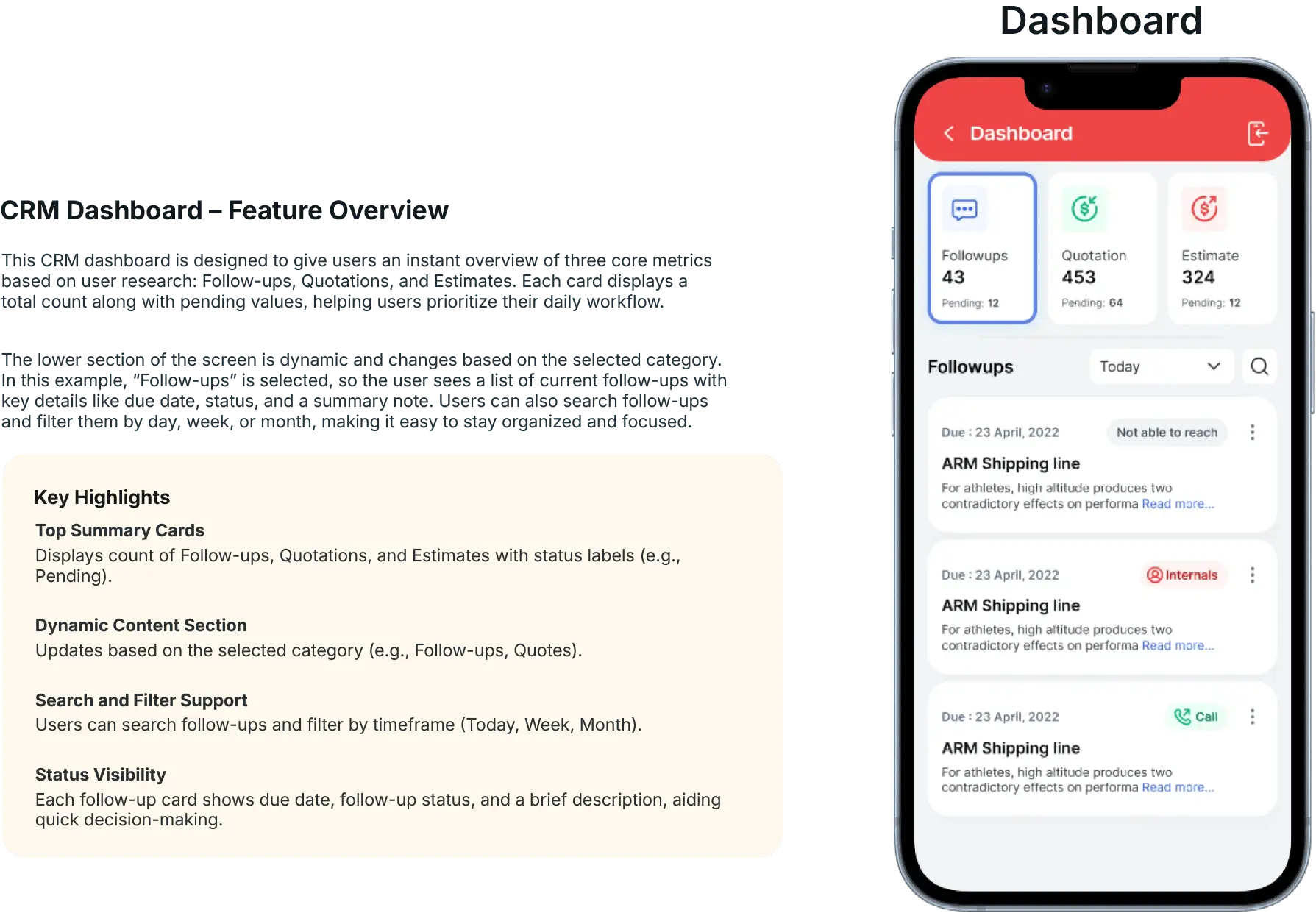 This case study outlines how I designed and delivered a mobile-first CRM experience from the ground up. The result was a lightweight, centralized, and intuitive platform that enabled freight forwarders to access critical tools quotations, KYC, lead status, vendor estimates, and contact records without relying on desktop systems.