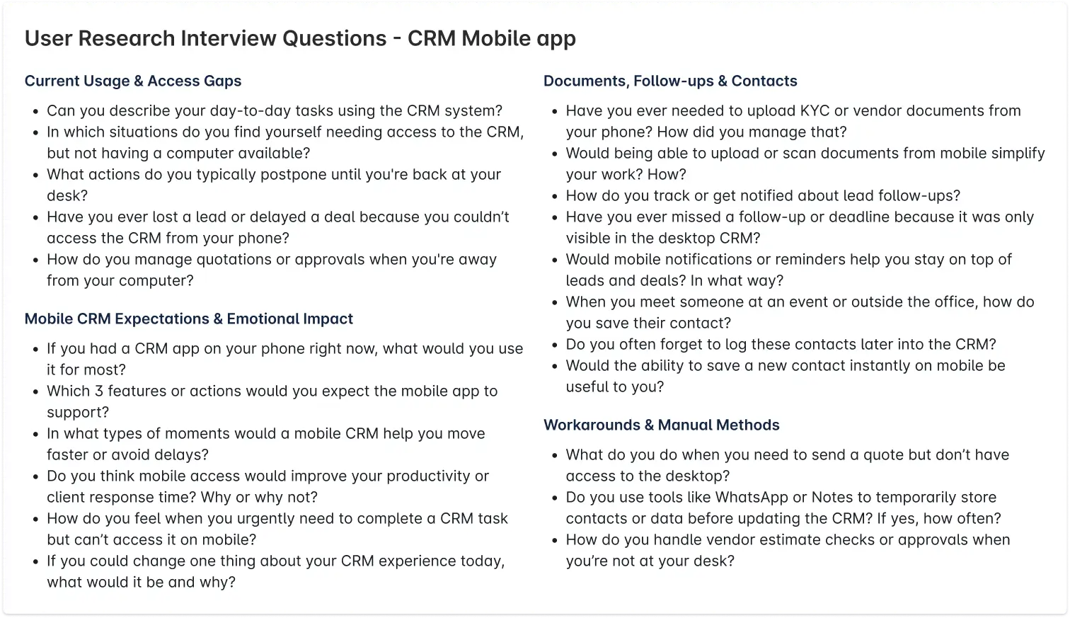 Since this was a B2B product, I couldn’t just download competitor apps and test them, as most required login credentials and weren’t publicly accessible. However, I still conducted a feature-level analysis of similar CRM tools based on: